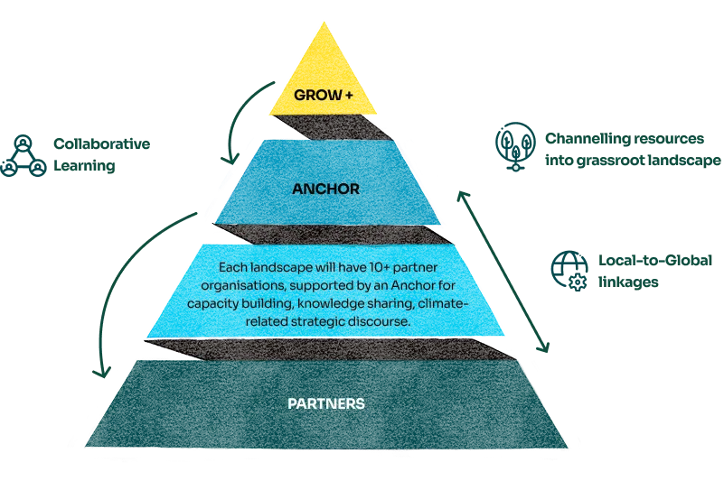 GROW+ works through a smart, three-tier capacity grid. The foundational layer, GROW Classic, focuses on core organisational capacities. Stacked above this, GROW+ adds two layers, with the middle providing capacities for climate resilient institutional growth and the top serving as an anchor-specific layer for organisations leading each landscape. Together, they form a blueprint for long-term community-led climate resilience.